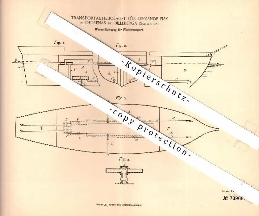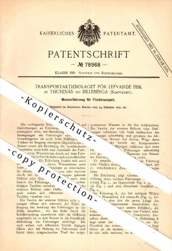 Original Patent - Transport för levande Fisk in Thurenäs b. Billeberga , 1891 , Boot für Fischtransport , Fisch Schweden