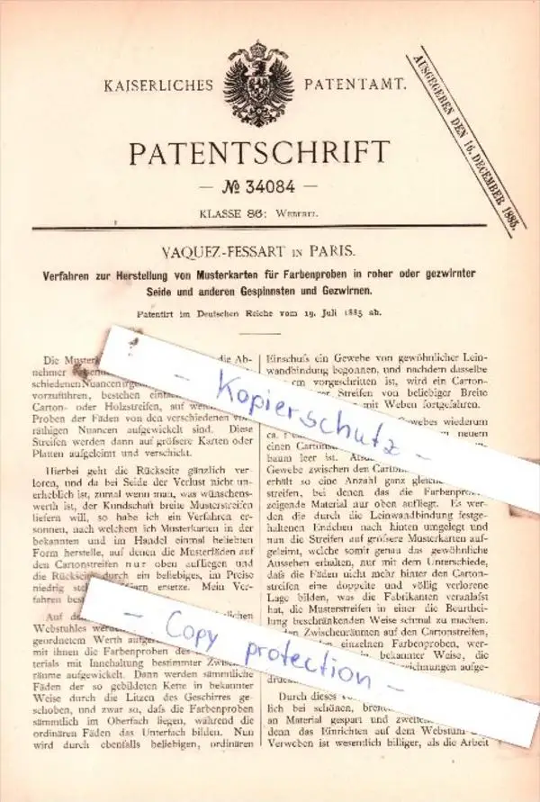 Original Patent - Vaquez-Fessart in Paris , 1885 , Weberei !!!