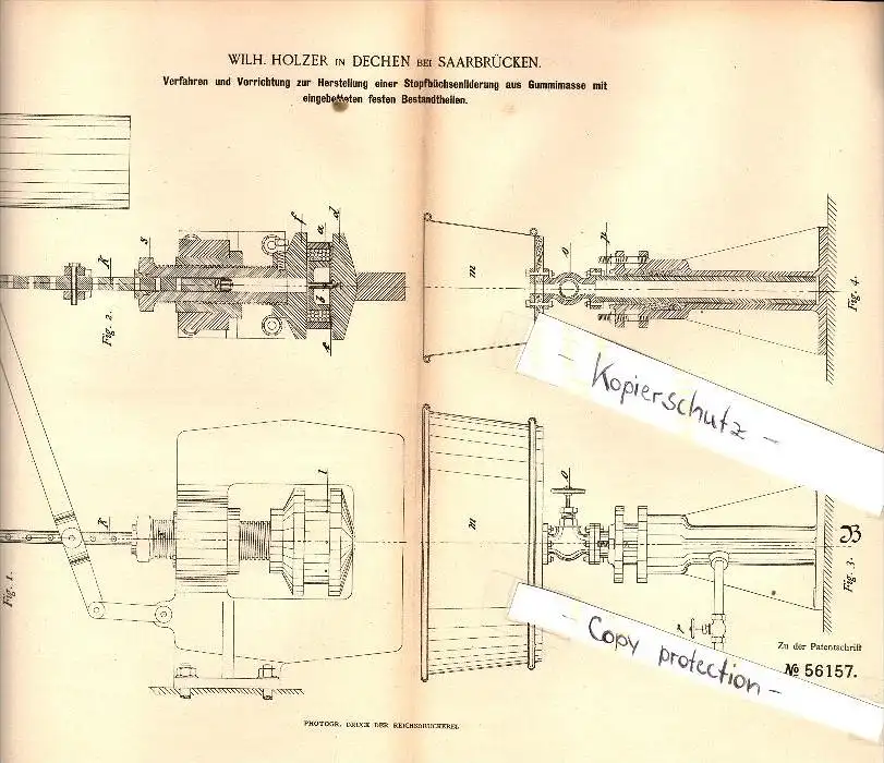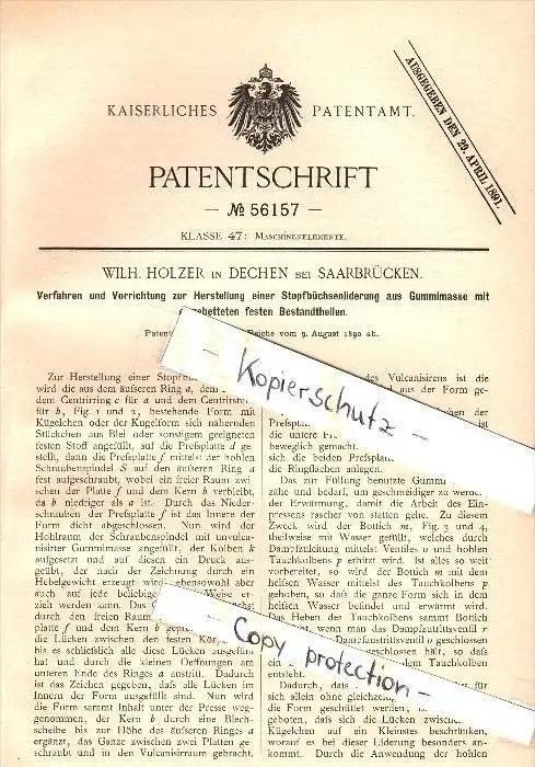 Original Patent - W. Holzer in Dechen / Saarland ,1890, Stopfbüchsenliderung , Maschinenbau , Neunkirchen , Saarbrücken