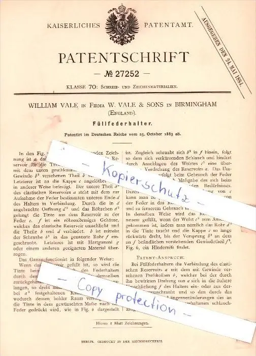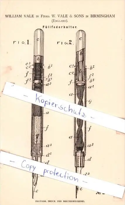 Original Patent - W. Vale in Firma W. Vale & Sohn in Birmingham , England , 1883 , Füllfederhalter , Federhalter !!!
