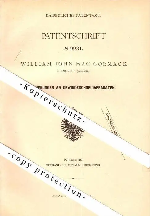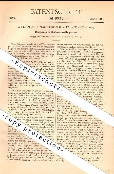 Original Patent - W.J. Mc Cormack in Paignton , 1879 , Tapping attachment !!!