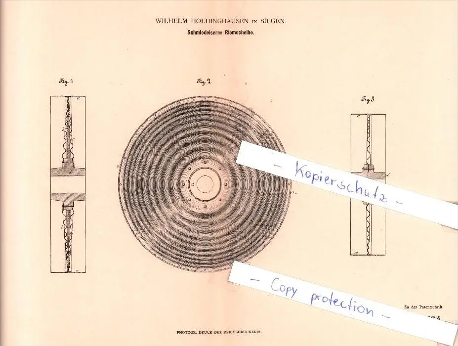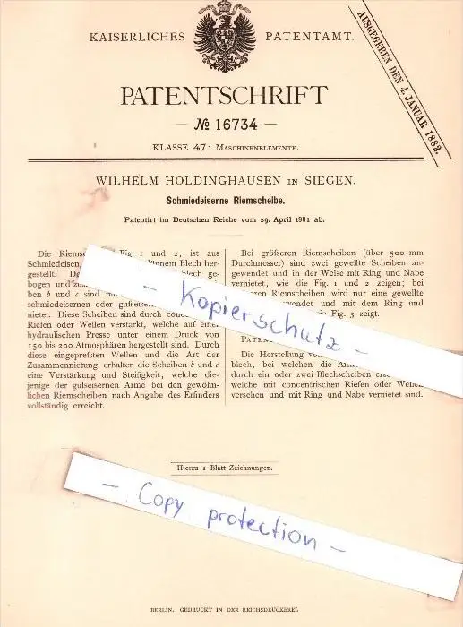 Original Patent - Wilhelm Holdinghausen in Siegen , 1881 , Schmiedeiserne Riemscheibe !!!