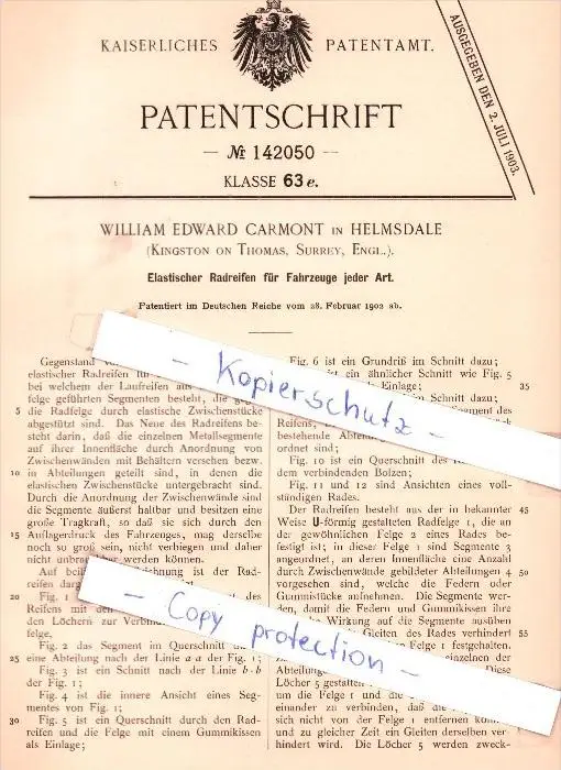 Original Patent - William Edward Carmont in Helmsdale , Kingston on Thomas , Surrey , Engl. , 1902 , !!!