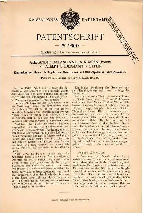 Patentinhaber: Alexander Baranowski , in Kempen / Kepno i. Posen und Albert Silbermann in Berlin Patent: Eidrücken der Samen in Kugeln aus Thon , Guano und Chilisalpeter vor dem Ankeimen Patentiert am: 6.05.1894 Z65