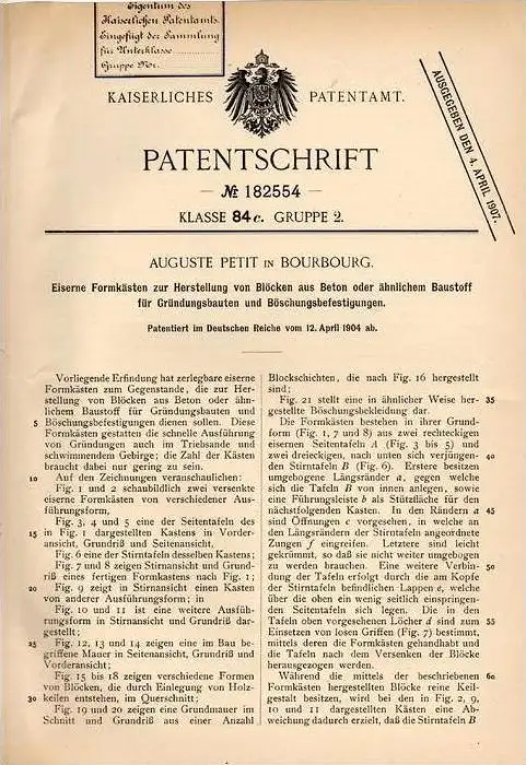 Original Patentschrift - A. Petit in Bourbourg , 1904 , Eiserne Form aus Beton !!!