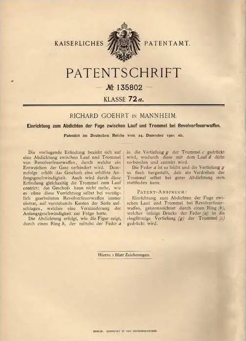 Original Patentschrift - Abdichtung für Revolver , Pistole , 1901 ,R. Goehrt in Mannheim !!!
