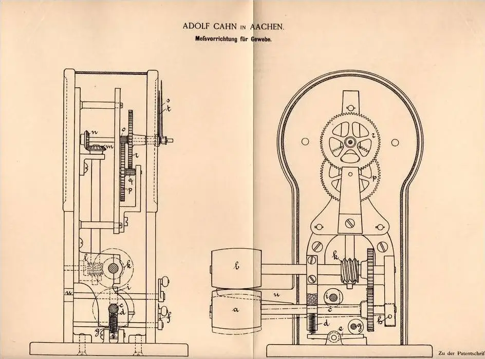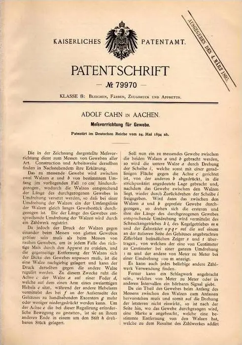 Original Patentschrift - Adolf Cahn in Aachen , 1894 , Meßapparat für Gewebe , Textilien !!!