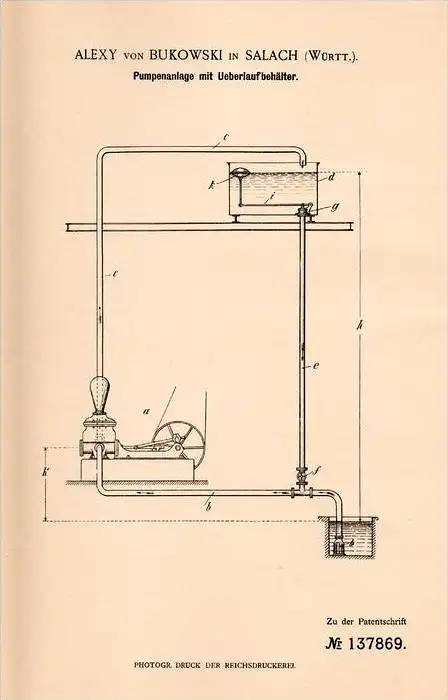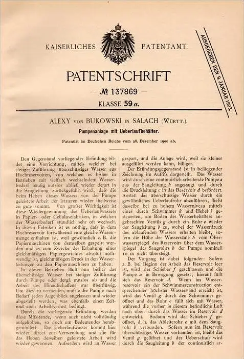 Original Patentschrift - Alexy von Bukowski in Salach i. Württ., 1900 , Pumpenanlage , Wasserwerk , Wasserpumpen !!!