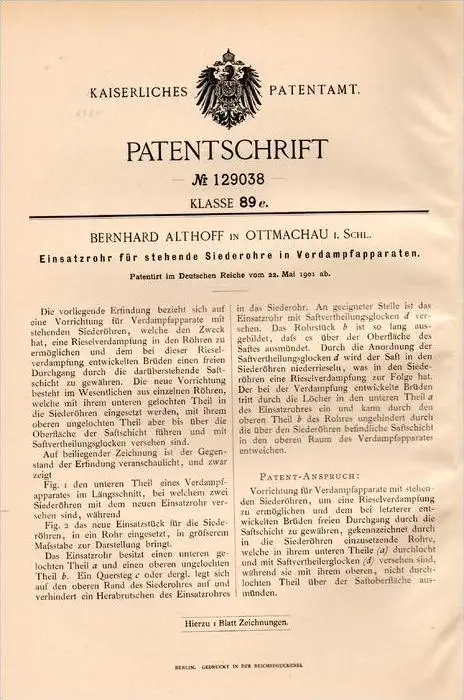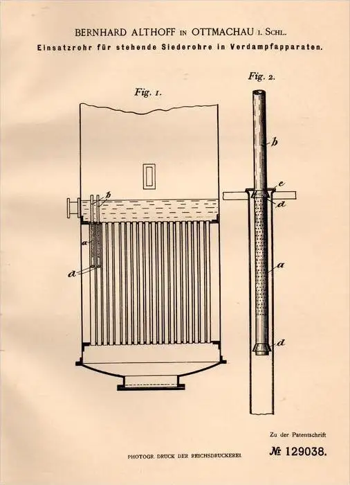 Original Patentschrift - B. Althoff in Ottmachau / Otmuchów , Schlesien , 1901 , Rohr für Verdampferanlage !!!