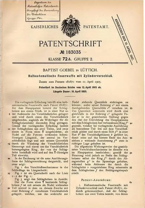 Original Patentschrift - B. Goebel in Lüttich , 1905 , halbautomatische Waffe , Gewehr , Feuerwaffe , Pistole !!!