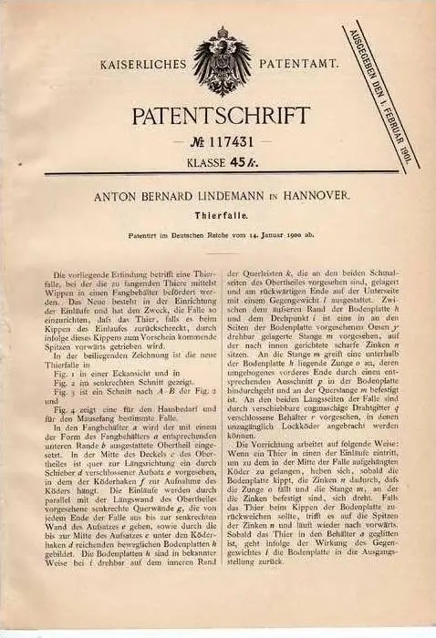 Original Patentschrift - B. Lindemann in Hannover ,1900, Tierfalle , Jagd , Jäger !!!