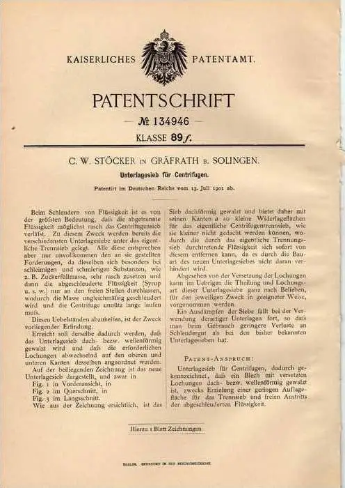 Original Patentschrift - C.W. Stöcker in Gräfrath b. Solingen , 1901 , Sieb für Centrifugen , Schleuder für Sirup !!!