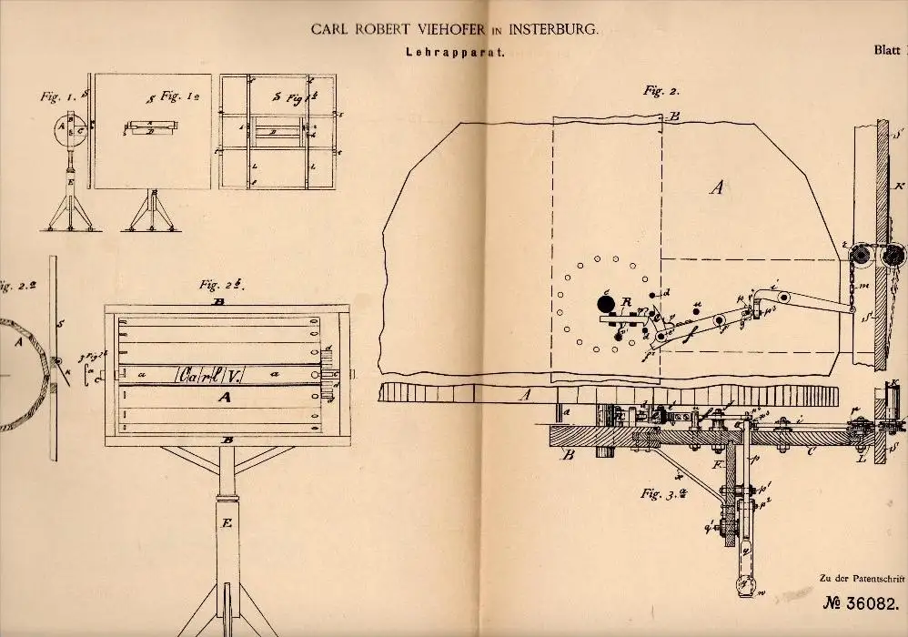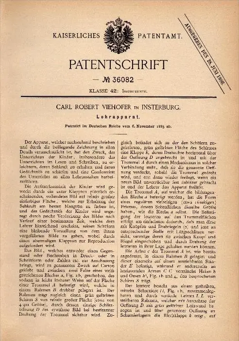 Original Patentschrift - Carl Viehofer in Insterburg / Tschernjachowsk , 1885 , Lehrapparat , Schule , Unterricht !!!