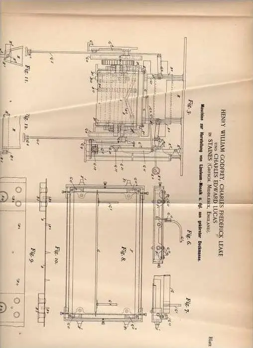 Original Patentschrift - Ch. Lucas in Staines , 1894 , Linoleum - Mosaik - Machine !!!