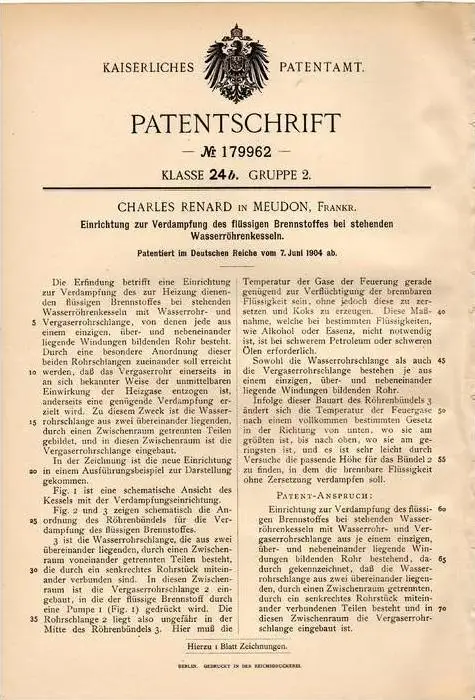 Original Patentschrift - Ch. Renard in Meudon , 1904 , Verdampfer für Brennstoffe , Heizung !!!