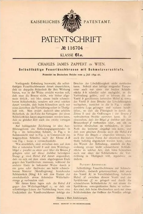 Original Patentschrift - Ch. Zappert in Wien , 1899 , Feuerlöschbrause , Feuerlöscher , Feuerwehr !!!