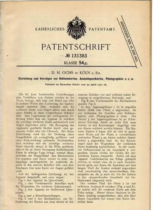 Original Patentschrift - D.H. Ochs in Köln a. Rhein ,1901 , Ansichtskarten Vorzeigeapparat , AK , Postkarte !!!