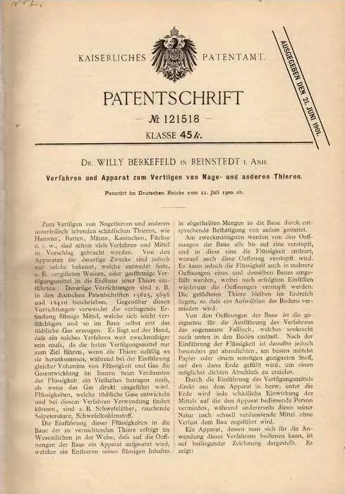Original Patentschrift - Dr. Berkefeld in Reinstedt , 1900 , Jagd , Jäger , Rattenfänger !!!