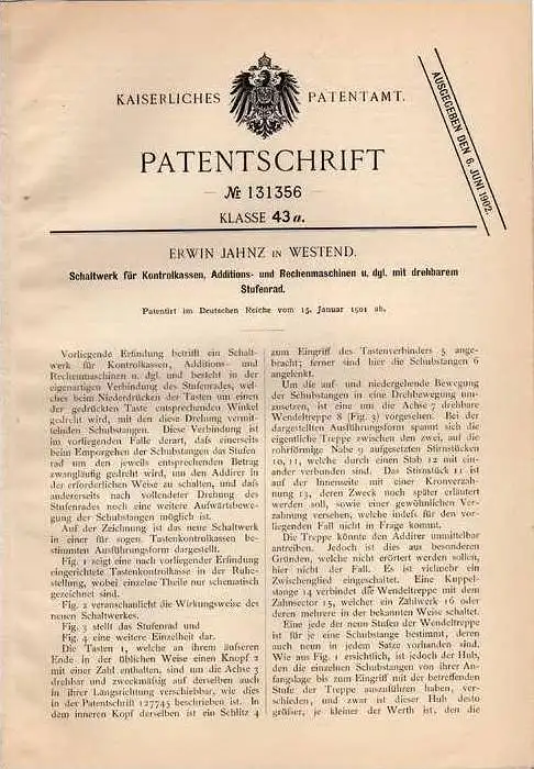 Original Patentschrift - E. Jahnz in Westend , 1901 , Rechenmaschine , Additionsmaschine , Mathematik , Schule !!!