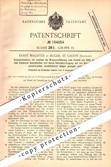 Original Patentschrift - E. Wachter in Buchs , Schweiz , 1905 , Acetylenlaterne , Laterne , Lampe , St. Gallen !!!