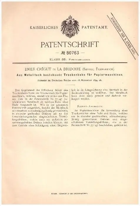 Original Patentschrift - Emile Crégut dans La Bridoire , Savoie , 1894 , Nappe sèche pour machines à papier !!!
