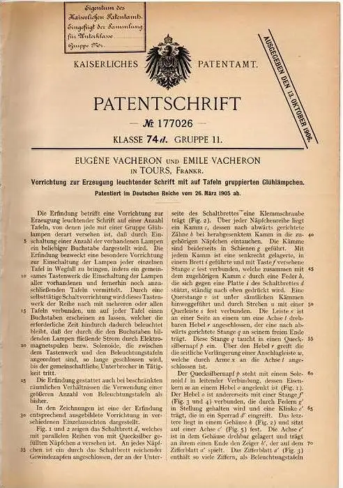 Original Patentschrift - Erzeugung von Leuchtreklame , 1905 , E. Vacheron in Tours , Reklame !!!