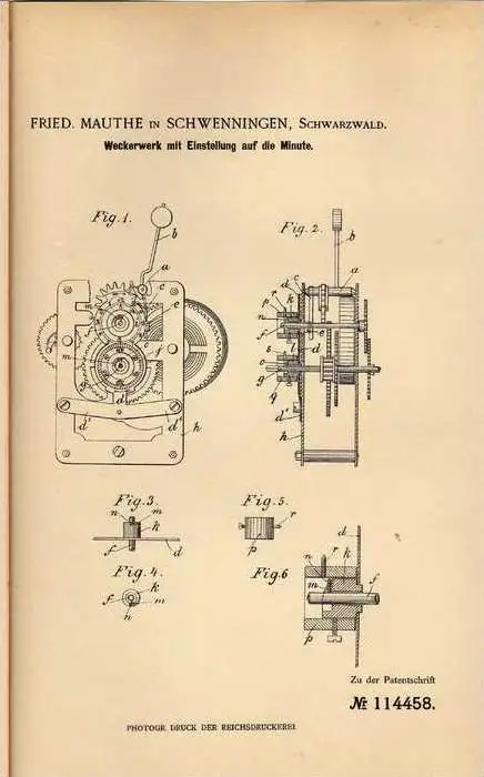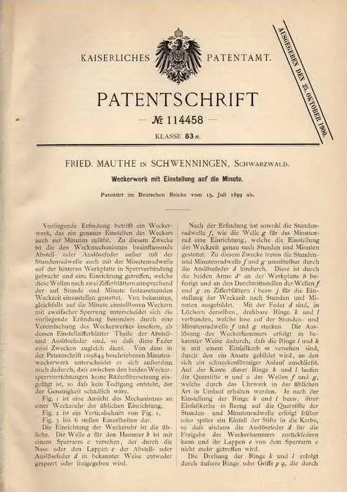 Original Patentschrift - F. Mauthe in Schwenningen , 1899 , Weckerwerk mit Minuteneinstellung , Uhr , Wecker !!!