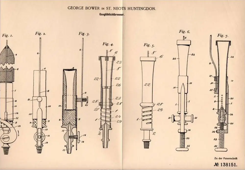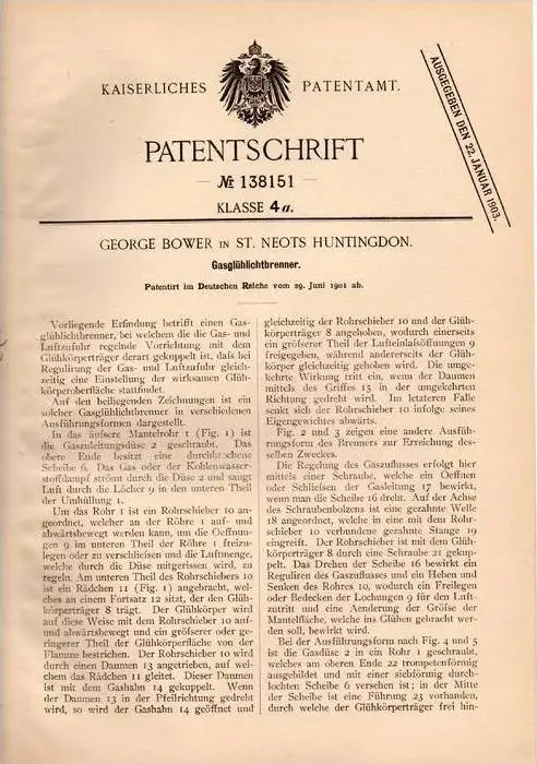 Original Patentschrift - G. Bower in St. Neots Huntingdon , 1901 , incandescent burner , light bulb , lamp !!!