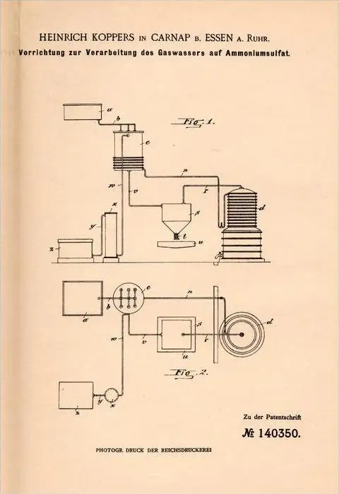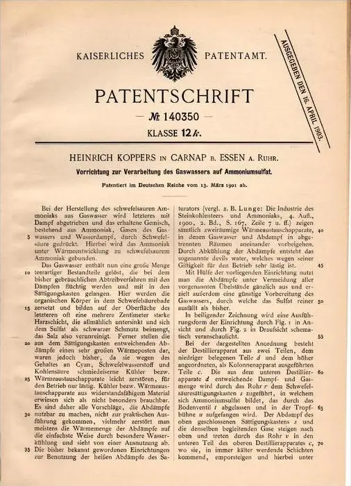 Original Patentschrift - H. Koppers in Carnap b. Essen , 1901 , Gas - Verarbeitung , Ammoniak , Schwefelsäure !!!