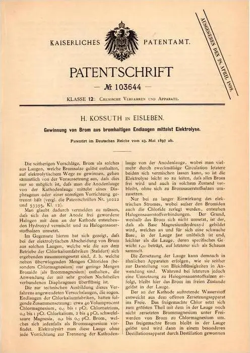 Original Patentschrift - H. Kossuth in Eisleben , 1897 , Gewinning von Brom durch Elektrolyse , Chemie !!!