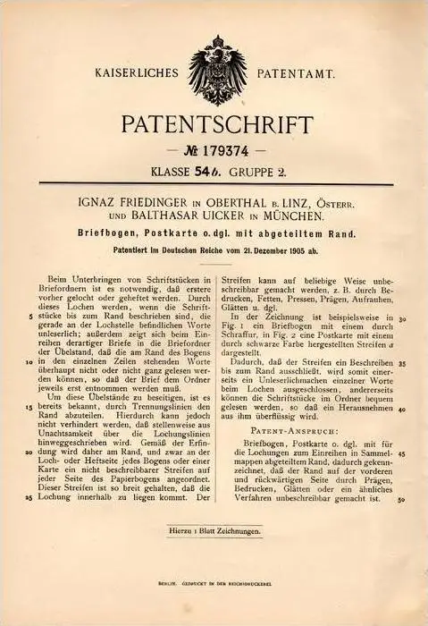 Patent: Briefbogen , Postkarte mit abgeteiltem Rand