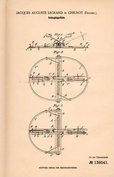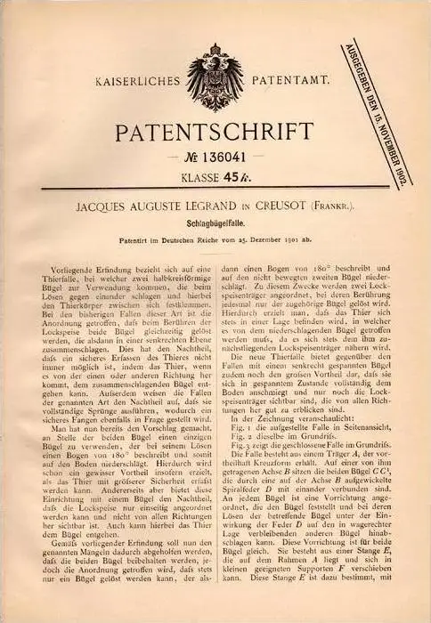 Original Patentschrift - J. Legrand in Creusot , 1901 , Falle für Tiere , Jagd , Jäger , Tierfalle !!!