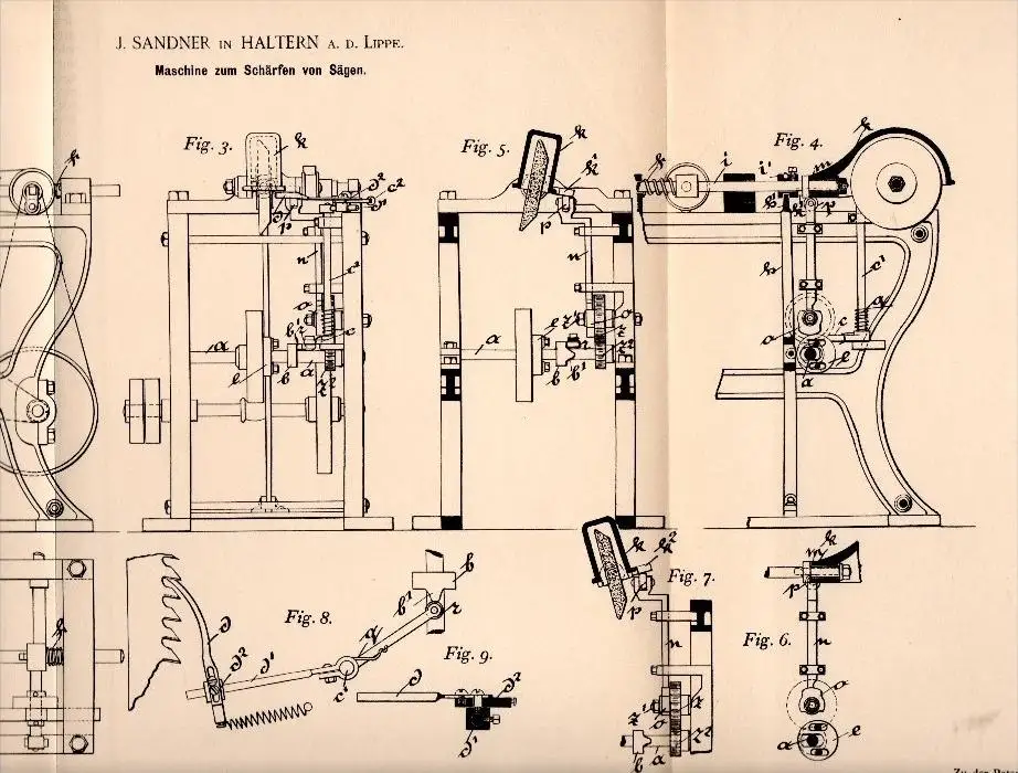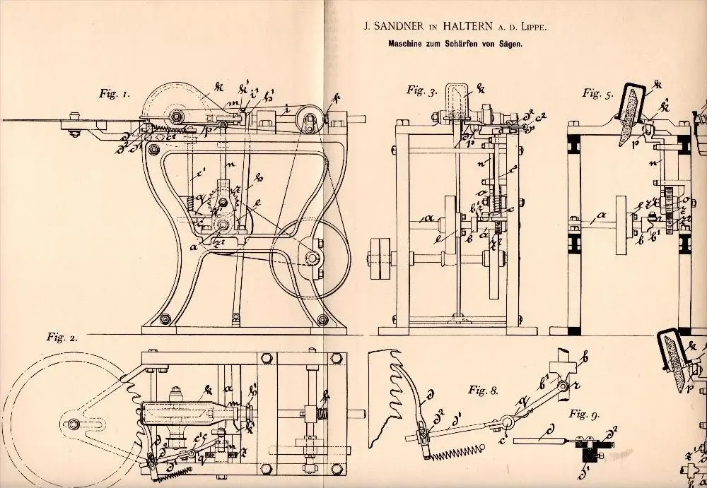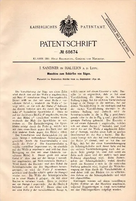 Original Patentschrift - J. Sandner in Haltern a.d. Lippe ,1892, Maschine zum Schärfen von Sägen , Tischlerei , Sägewerk