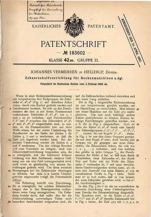 Original Patentschrift - J. Vermehren in Hellerup , Dänemark , 1906 , Rechenmaschine , Mathematik , Rechner !!!