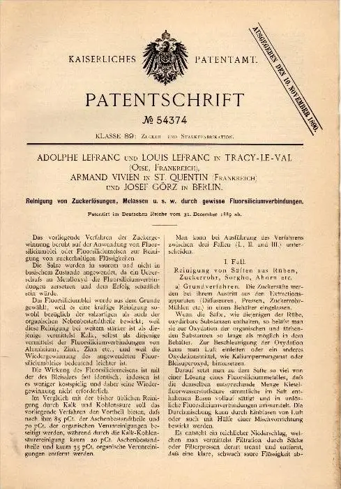 Original Patentschrift - L. Lefranc dans Tracy-le-Val / Oise ,1889 , Purification of sugar , chemicals , laboratory !!!
