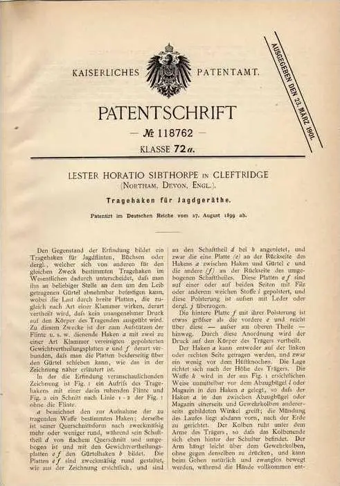 Original Patentschrift - L. Sibthorpe in Cleftridge , 1899 , Tragehaken für Jagdflinten , Jagd , Gewehr !!!