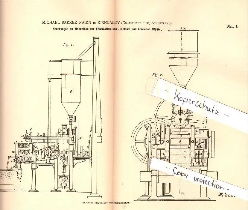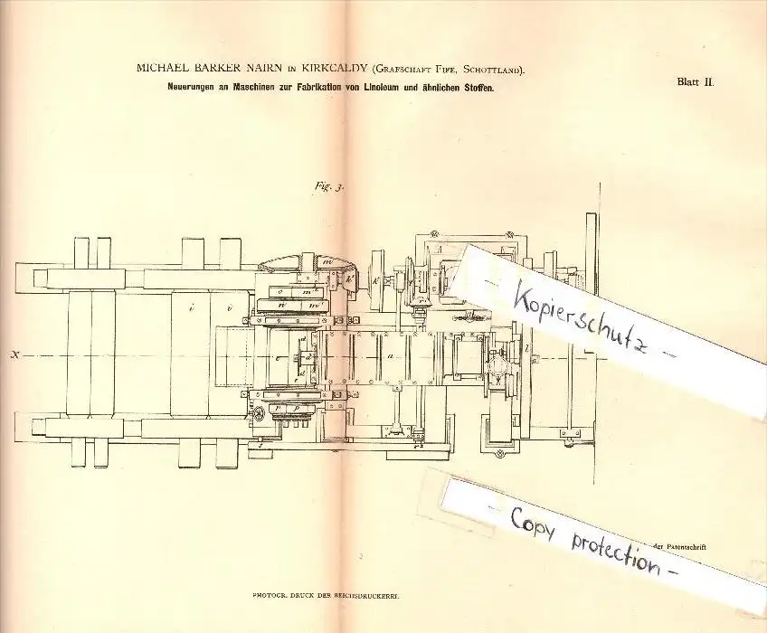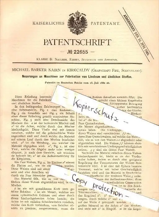 Original Patentschrift - M. Barker Nairn in Kirkcaldy , Scotland , 1882 , Machine for the manufacture of linoleum !!!