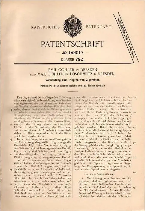 Original Patentschrift - M. Göhler in Loschwitz b. Dresden , 1903 , Stopfen von Zigaretten , Zigarette !!!