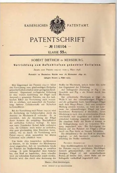 Original Patentschrift - R. Dietrich in Merseburg , 1899, Cellulose Vorrichtung !!!
