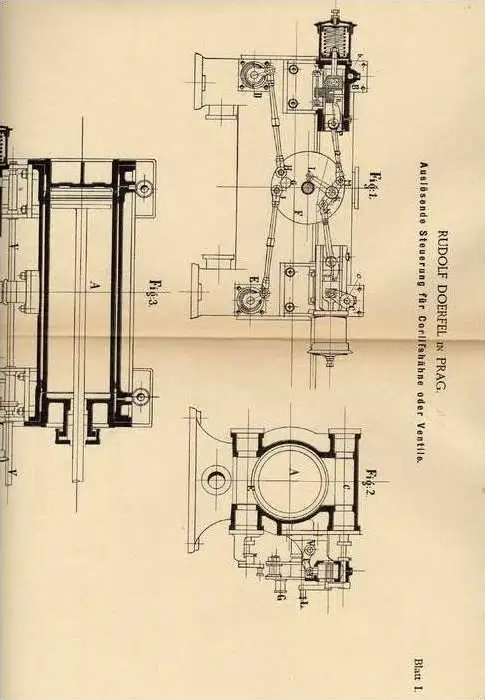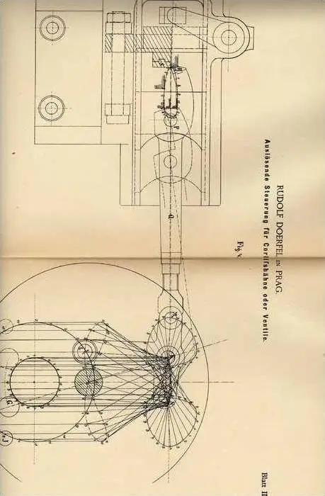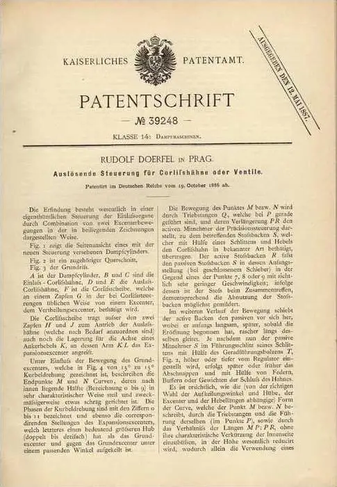 Original Patentschrift - R. Doerfel in Prag , 1886 , Steuerung für Dampfmaschine !!!
