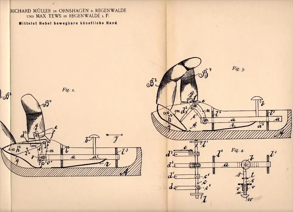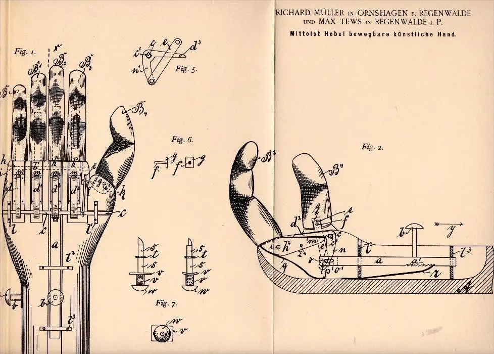 Patent: Mittels Hebel bewegbare künstliche Hand