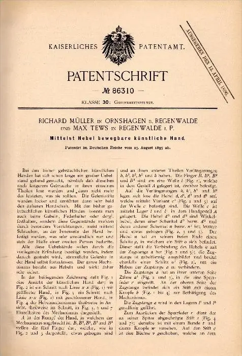 Original Patentschrift -R. Müller in Ornshagen b. Regenwalde / Resko , 1895 , künstliche Hand , Prothese , Max Tews !!!