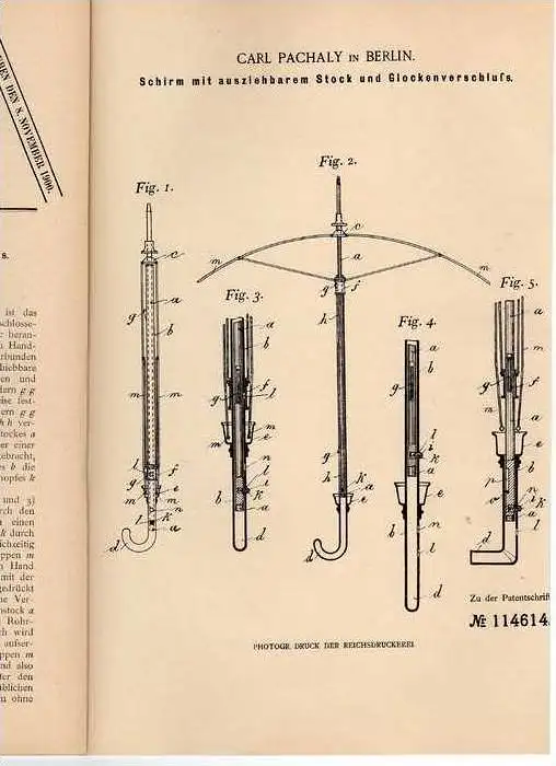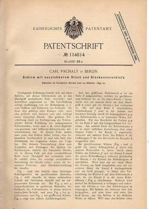 Original Patentschrift - Schirm mit ausziehbarem Stock, 1899 , C. Pachaly in Berlin !!!