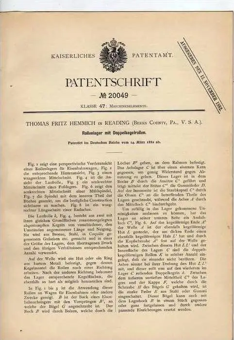 Original Patentschrift - T. Hemmich in Reading , USA , 1882 , Rollenlager , Kugellager !!!