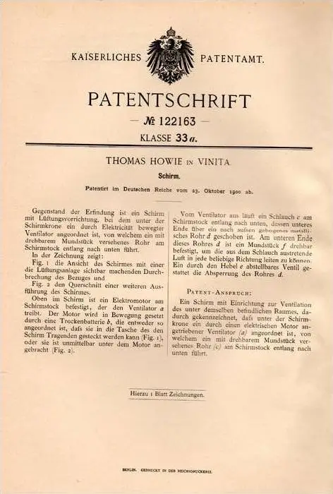Original Patentschrift - Th. Howie in Vinita , Oklahoma , 1900 , parasol umbrella with fan !!!