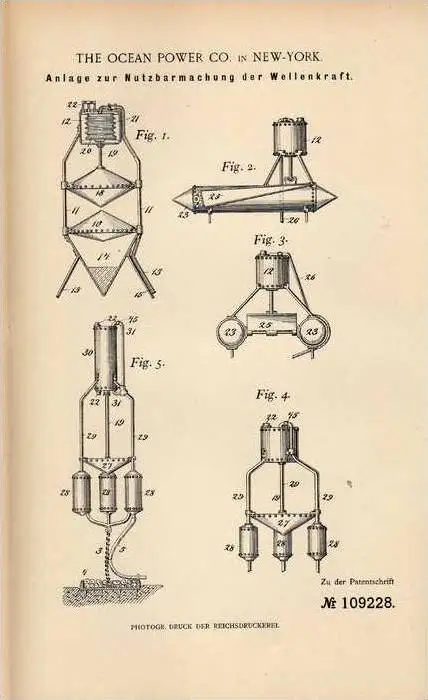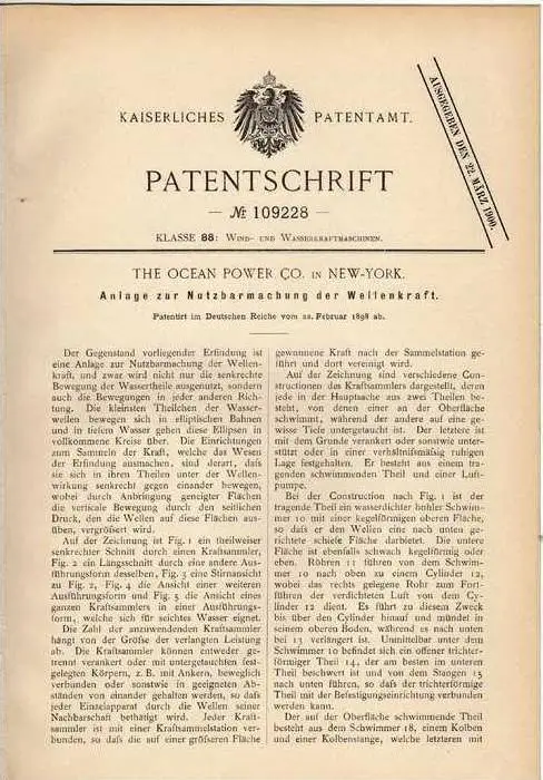 Original Patentschrift - The Ocean Power Co in New York , 1898 , Apparat zur Nutzung der Wellenkraft , Ozean , Meer !!!