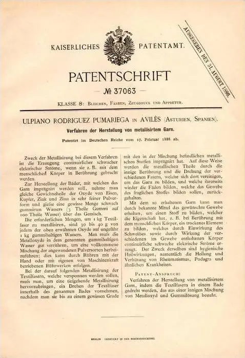 Original Patentschrift - U. Pumariega in Avilés , Asturien , 1886 , Metall - Garn , Textilien !!!