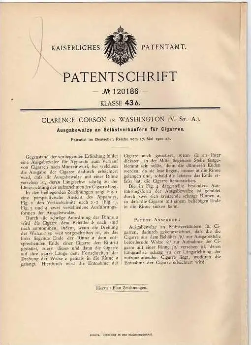 Patent: Ausgabewalze an Selbstverkäufern für Cigarren