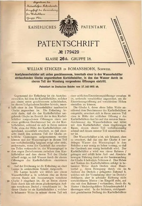 Original Patentschrift - W. Stricker in Romanshorn , Schweiz , 1905 , Acetylenentwickler !!!