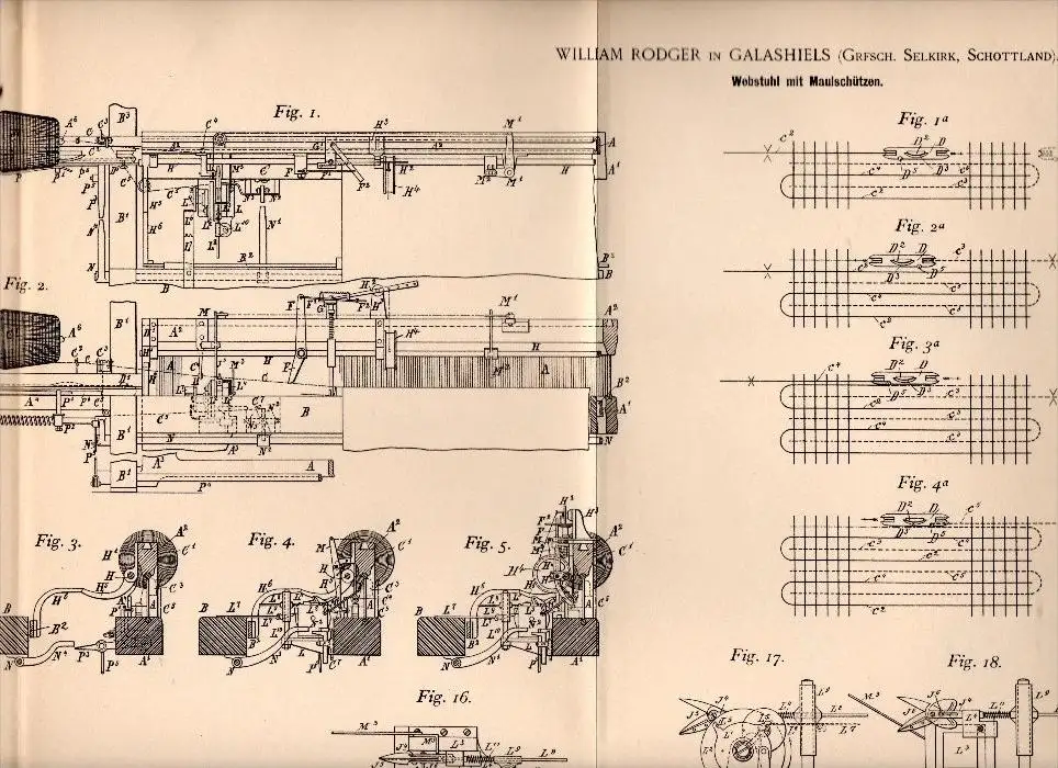 Original Patentschrift - William Rodger in Galashiels , Scotland , 1895 , Loom for weaving !!!